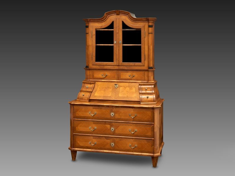 Kikiáltási ár: 80 000 FtOvális forma, fenyőfa alapon dió, rózsafa és jávor berakással, aranyozott sárgaréz veretekkel díszítve. Felújított állapotban, XIX. század vége. M.: 45 × 77 cm