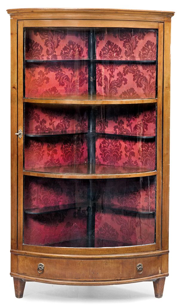 Műtárgy leírás – magyar, 19. sz. vége, fenyőfa alapon diófa borítással, hajlított üvegekkel, alul egy fiókkal, sárgaréz veretekkel, kis sérüléssel, 1 db kulccsal, 164*95*64 cm