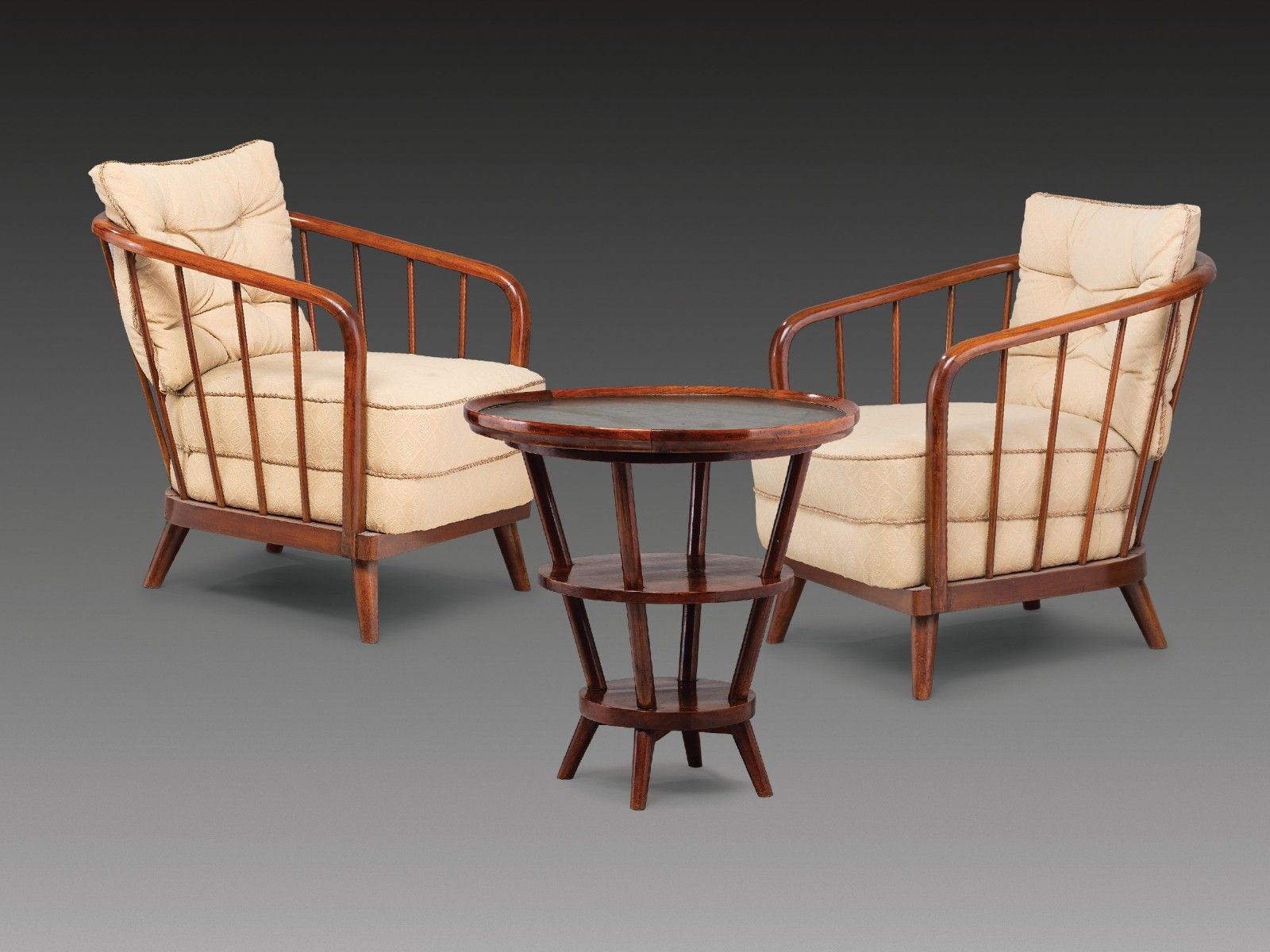 Asztal, két fotel. Faragott, pácolt bükkfa.