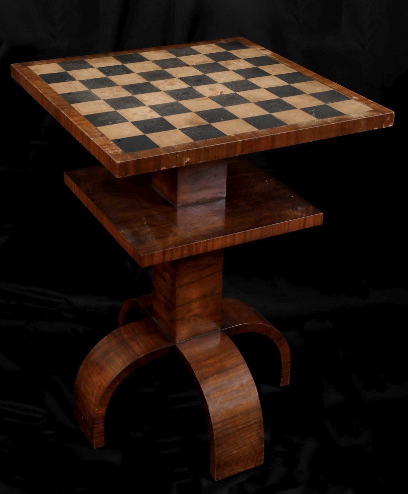 Sakk asztal, art deco, a játékmező faragott betét, fa, 68 x 49 x 49 cm