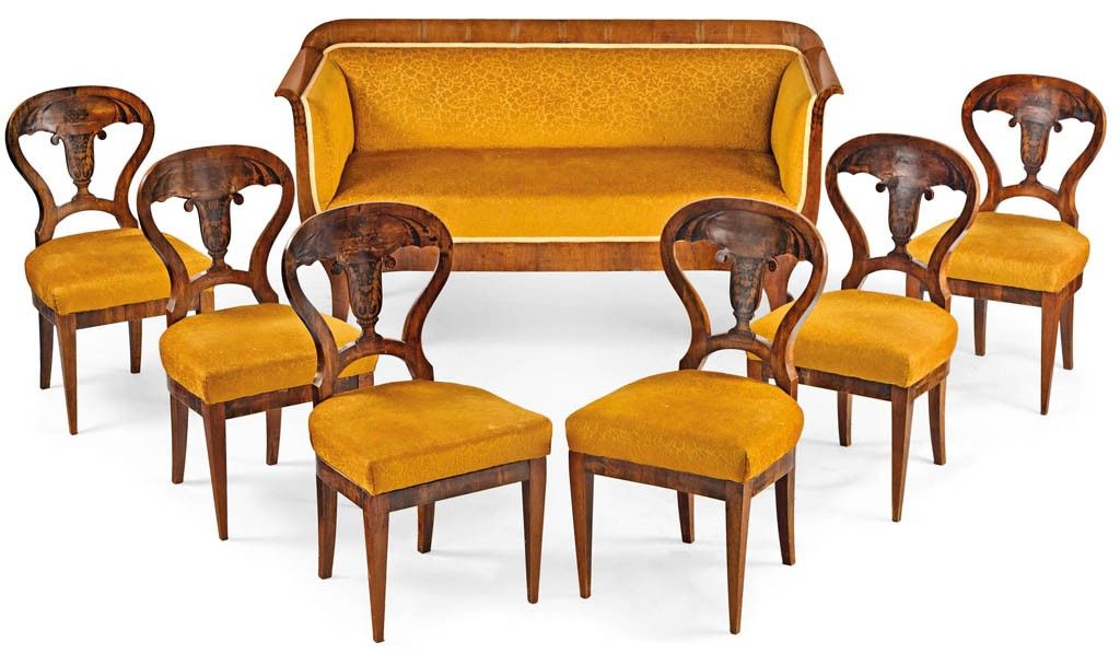 Kikiáltási ár: 120 000 Ftmagyar, 19. sz. vége, tömör diófa, faragott díszítéssel, préselt bőr kárpittal, sárgaréz szegecsekkel, háttámlákon C.B.H. monogrammal, sérült 98*46*44 cm
