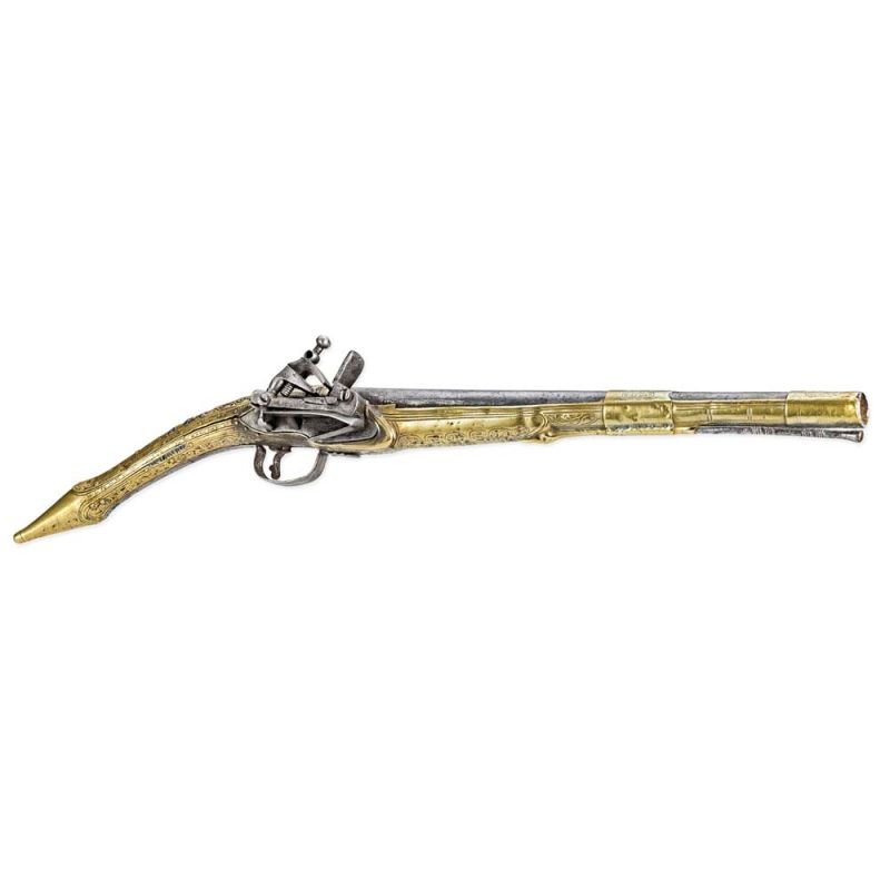 Műtárgy leírás – 1800 körül, elől töltős, balkáni kovás, spanyol lakattal, vésett sárgaréz és kovácsoltvas, töltőpálcával, h: 52 cm