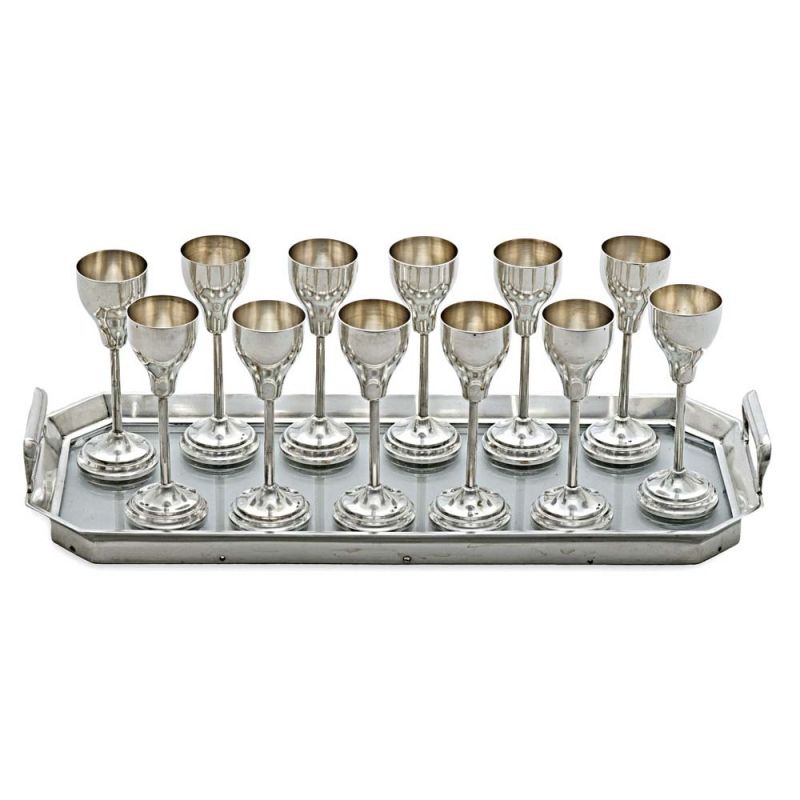 Műtárgy leírás – Bécs, 1872-1922 közötti és Pest, 1867-1936 közötti fémjel, 800-ezrelékes ezüst, "VO" és "FJ" mesterjegy, art deco stílusú füles tálca üveglappal, fémnyomott poharak, össz: 13 db, tálca Btto.: 1056 g; 36,2*14,8 cm, poharak: 433 g; m: 11 cm