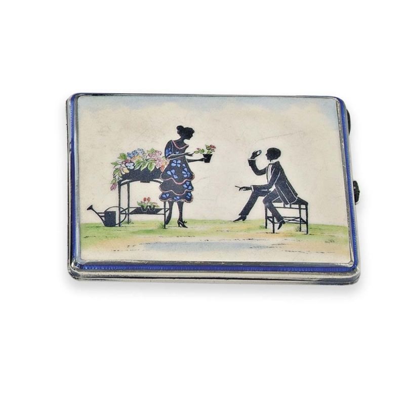 Műtárgy leírás – Bécs, 1872-1922 közötti fémjel, 900-ezrelékes ezüst, ismeretlen mesterjegy, fedlapon udvarlási jelenettel, festett és vonalzománc díszítéssel, 160,8 g; 10,2*8*1,2 cm