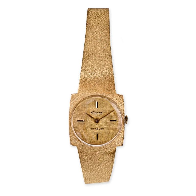 Műtárgy leírás – 20. sz. második fele, 2005-utáni budapesti fémjellel ellátva, 14 k arany tok, szíj és csat jelzett: Elegance Incabloc, indexes számlap, mattított milanéz karpántba épített szerkezet,, működik, állítható csat és biztonsági lánc, Btto: 59,4