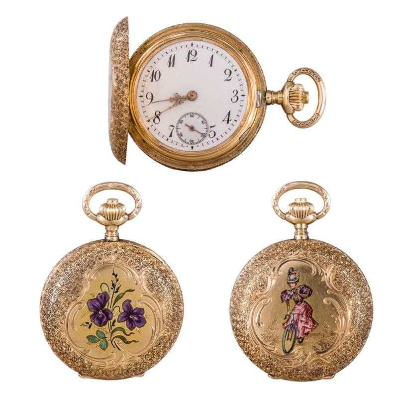Műtárgy leírás – Svájc, 1872-1902 közötti bécsi behozatali jellel, 14 k arany tok és szerkezettakaró, arab számos, kis másodperckörös, zománcozott számlap, fedlapján beágyazott zománc bicikliző hölgy,, hátlapján zománc ibolyák, finom vésettel díszítve, to