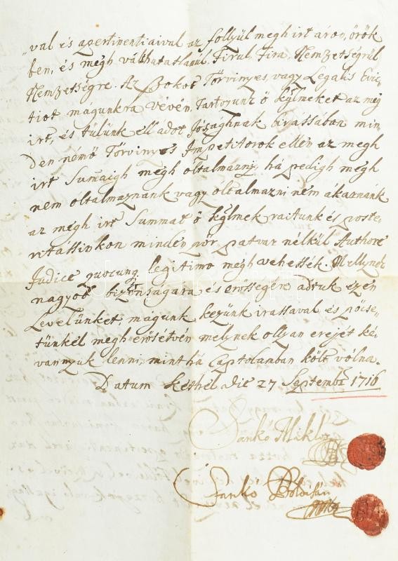 1716 Balatonőszödi föld eladásáról szóló magyar nyelvű szerződés aláírásokkal viaszpecsétekkel