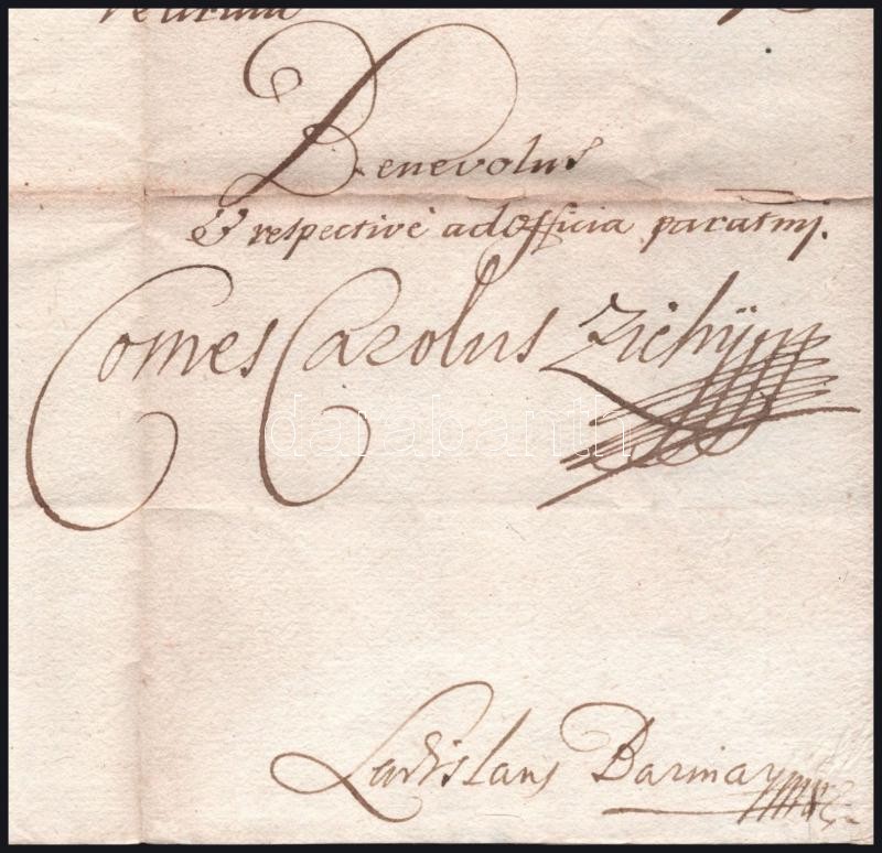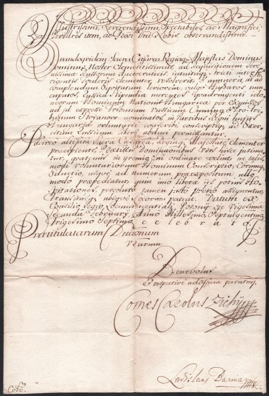 1737 Pozsony, a Helytartótanács tudósító levele (intimatorium) Szatmár vármegyének az orosz hadsereg Cumming és Sztojanov huszárezredeibe toborzandó lovaskatonák ügyében, gróf Zichy Károly helytartótancsi tanácsos aláírásával és Barinay László helytartóta