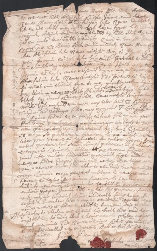 1750 Marosszéki (ákosfalvi) ülnökök magyar nyelvű tanúságlevele szántóföldeket érintő zálogügyben, sérülésekkel, rányomott viaszpecsétek töredékével / 1750 A testimony written by Szekler noble assessors of Acăţari (Scaunul