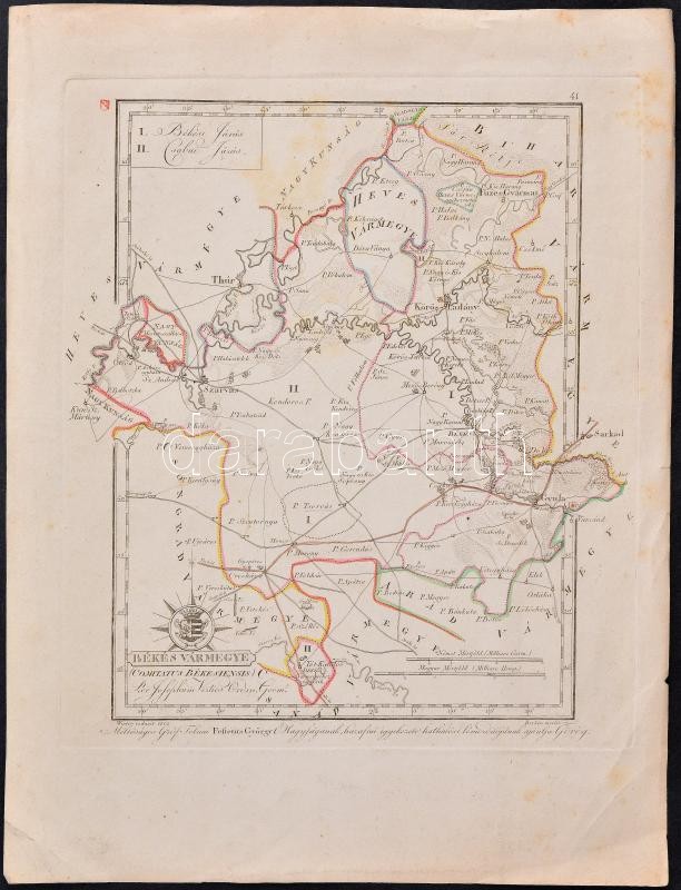 1802 Békés vármegye. Comitatus Békésiensis. Színezett rézmetszet, papír, 31×26,5 cm Békés vármegye közigazgatási térképe megyecímerrel, a járások, utak, települések, vízrajz, domborzat feltüntetésével, a budai kezdőmeridiánhoz igazítva. Vertics József (17