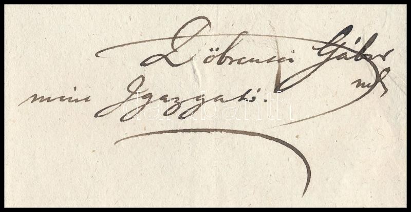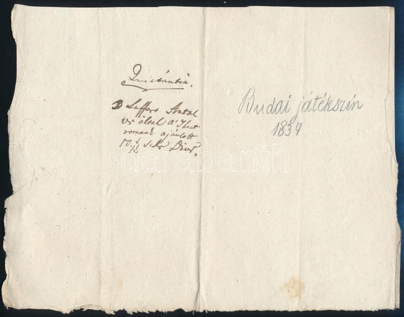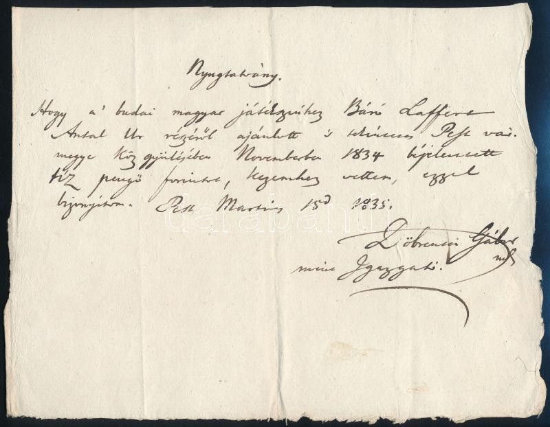 1835 március 15. A budai magyar játékszínház javára ajánlott összeg befizetéséről szóló nyugta Döbrentei Gábor (1785-1851) igazgató, költő, királyi tanácsos, az MTA tagja, a történelem szó megalkotójának autográf írásával és aláírásával 26×21 cm<a h