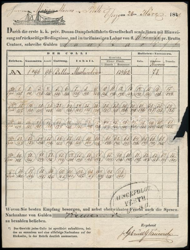 1849 DDSG hajóraklevél Essegről Pestre küldött árukról