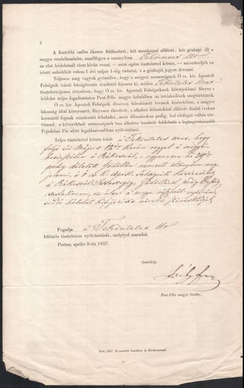 1857 Az uralkodópár Ferenc József és Erzsébet királyné magyarországi látogatása programjának részletes leírása, valamint Sigray Lajosnak (1804-1874) szóló személyes, kézzel írt utasítással mely szerint nemzeti öltönyben kísérje a delegációt Pest-Pilis vár