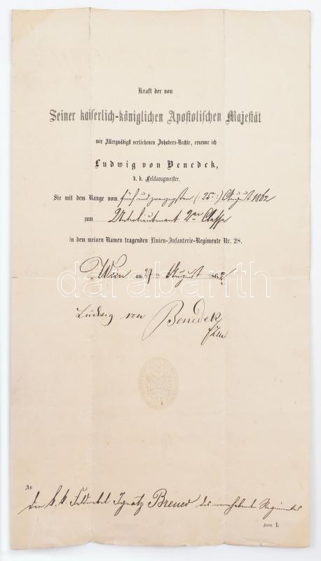 1862 Bécs, Alhadnagyi kinevezés a 28. gyalogezred kötelékébe, Benedek Lajos táborszernagy, mint ezredtulajdonos eredeti aláírásával, szárazpecséttel, 35,5×22 cm