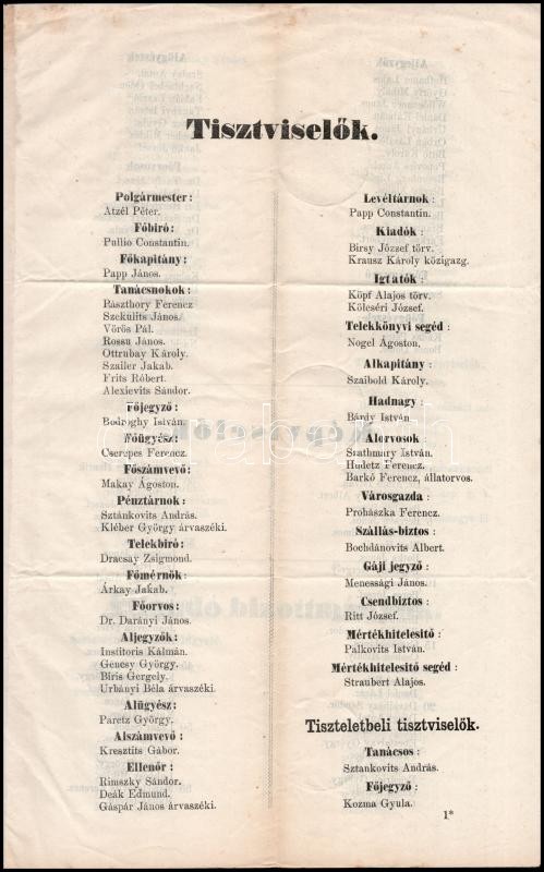 1867 Arad város tisztviselőinek és képviselőinek névjegyzéke az 1867. évben