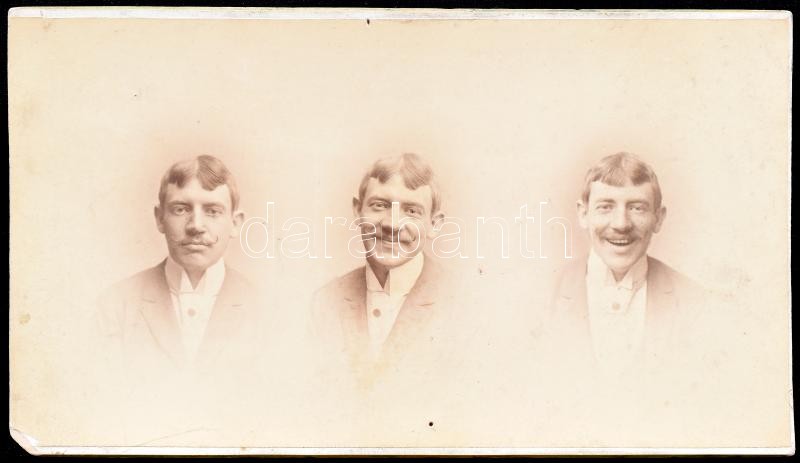 1890 Kézdi-Kovács László (1864-1942) festőművész hármas portréja, vintage keményhátú trükkfotó, Oroszi Lajos nagybecskereki műterméből, hátoldalán feliratozott, bal alsó sarkában kissé sérült és hiányos, középső részén alul és felül apró lyukkal (feltehet
