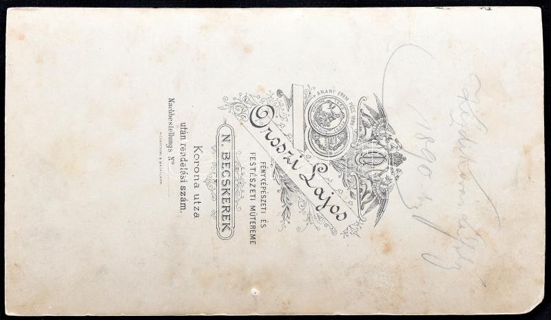 1890 Kézdi-Kovács László (1864-1942) festőművész hármas portréja, vintage keményhátú trükkfotó, Oroszi Lajos nagybecskereki műterméből, hátoldalán feliratozott, bal alsó sarkában kissé sérült és hiányos, középső