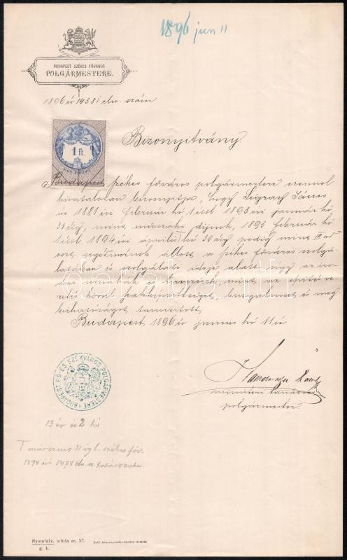 1896 Kammermayer Károly (1829-1897) budapesti polgármester aláírt igazolása Sigray János fővárosi mérnök részére 1Ft illetékbélyeggel