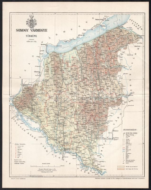 1897 Somogy vármegye térképe, tervezete: Gönczy Pál, 1:520.000 , Pallas Nagy Lexikona, Bp., Posner Károly Lajos és Fia-ny., hajtásnyommal, 26×22 cm
