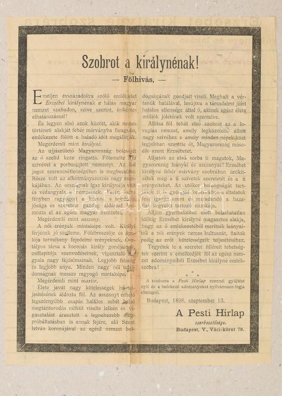 1898 Szobrot a királynénak – A Pesti Hírlap felhívása kartonra ragasztva, kissé sérült. 21×28 cm