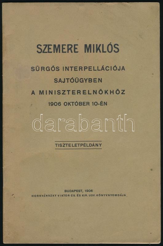1906 Szemere Miklós sürgős interpellációja sajtóügyben a miniszterelnökhöz. 1906. okt. 10-én. Tiszteletpéldány. Bp., 1906., Hornyánszky Viktor, 29 p. Kiadói papírkötés, kissé foltos borítóval.<a href="https://www.darabanth.com/hu/gyorsarveres/410/ka