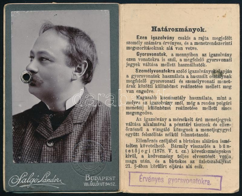 1907 Gróh István (1867-1936) iparművész, művészettörténész, az Országos Magyar Királyi Iparművészeti Iskola (ma: Moholy-Nagy Művészeti Egyetem) tanára, későbbi rektora (1927-1925) fényképes félárú vasúti igazolványa, Cs. Kir. Szab. Déli Vaspálya-Társaság,