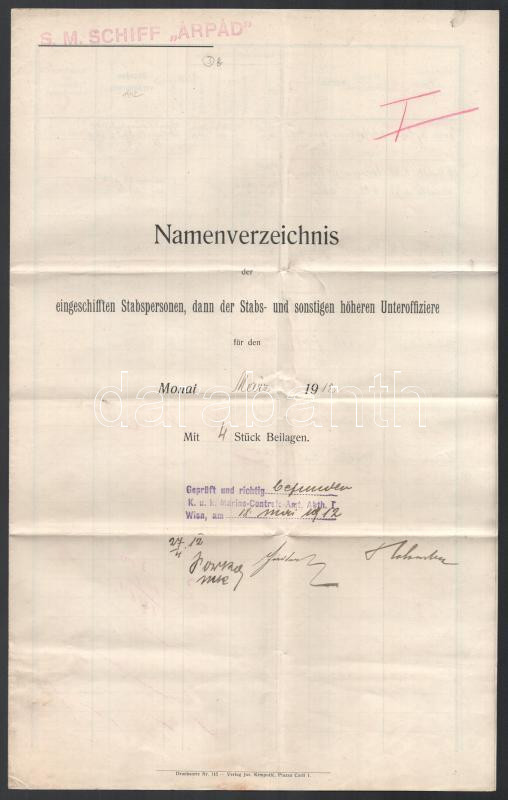1912 Az S.M.S. Árpád osztrák-magyar hadihajó kimutatása a márciusban fedélzetre lépet magas rangú tisztekről A parancsnok aláírásával és a hajó pecsétjével, részletezve a személyekkel / Namenverzeichnis for the month of March 1912. Four-page document signed in Pola on March 31, 1912. Numerous NCOs: Korvettenkapitän Count Egon Meis-Colloredo (gazetted Linienschiffsleutnant on May 1, 1899; not found in the 1917 Rangliste) Seal: S. M. Schiff árpád (108 x 10 mm)