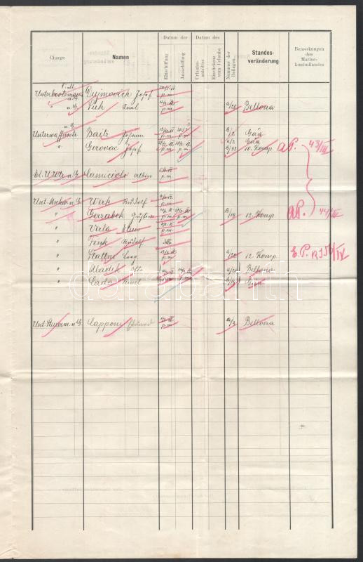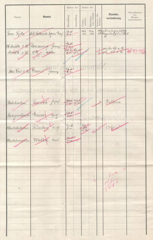 1912 Az S.M.S. Árpád osztrák-magyar hadihajó kimutatása a márciusban fedélzetre lépet magas rangú tisztekről A parancsnok aláírásával és a hajó pecsétjével, részletezve a személyekkel / Namenverzeichnis for the month of March 1912. Four-page document signed in Pola on March 31, 1912. Numerous NCOs: Korvettenkapitän Count Egon Meis-Colloredo (gazetted Linienschiffsleutnant on May 1, 1899; not found in the 1917 Rangliste) Seal: S. M. Schiff árpád (108 x 10