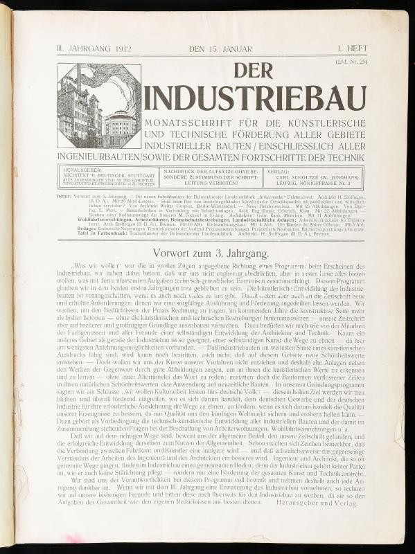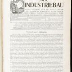 1912 Der Industriebau német nyelvű ipari-építészeti folyóirat III. évfolyamának számai egybekötve, gazdag fekete-fehér képanyaggal illusztrálva, számos korabeli hirdetéssel. Egészvászon-kötésben, kissé kopott, ázott