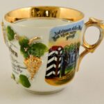 1912 Katona fiú által szüleinek ajándékozott, megszemélyesített, verses, katonákat és katonai jelenetet ábrázoló porcelán kávés bögre. Kézzel festett, dombor díszekkel. nagyon apró lepattanásokkal / Soldier son’s present to his parents with military scene