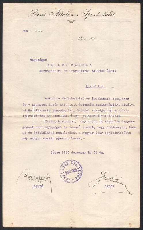 1913 2 gratuláló levél a kassai kamara elelnökének Beller Károlynak királyi kitüntetése alkalmából