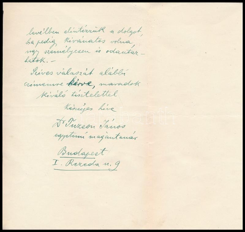 1913 Dr. Tuzson János egyetemi tanár, botanika professzor saját kézzel írt sorai