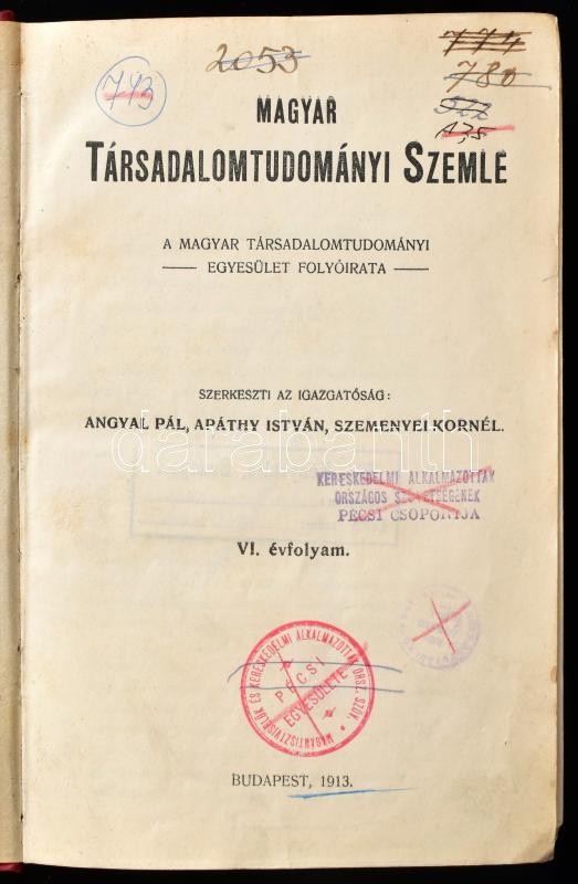 1913 Magyar Társadalomtudományi Szemle. VI. évf. Szerk.: Angyal Pál, Apáthy István, Szemenyei Kornél. Bp., 1913., Pesti Könyvnyomda Rt., 806 p. Átkötött, kopott, foltos félvászon-kötés, intézményi bélyegzőkkel.