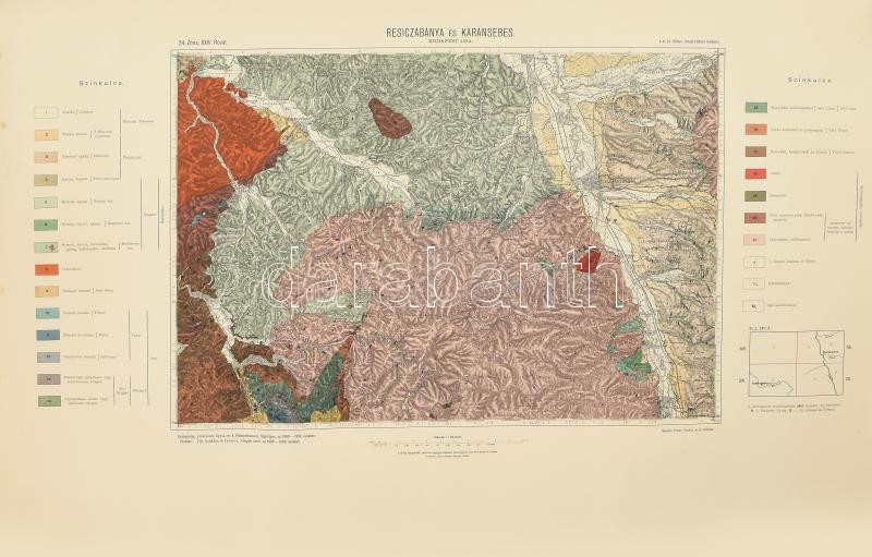 1914 Resicabánya és Karánsebes és környéke geológiai térképe, színes litográfia, 24. Zóna XXVI. Rovat, 1:75.000, Rajzolta: Pitter Tivadar. Felvették: Halaváts Gyula, Schafarzik Ferenc, Bécs, Cs. és Kir. Katonai Földrajzi Intézet, feltekerve, a szélén foltos, jó állapotban, 38×53 cm, teljes: 67×92