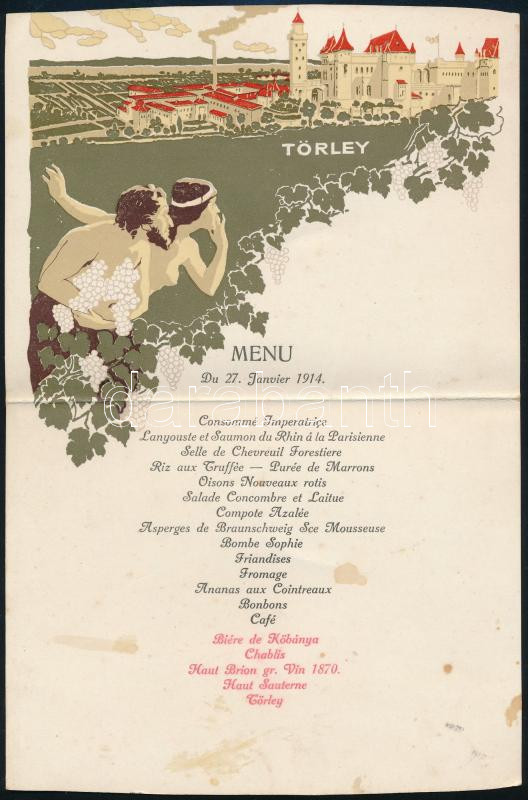1914 Törley szecessziós menükártya, 1914 jan. 27., francia nyelvű menüsorral, rajta izgalmas italokkal (Chablis, Haut Brion gr. Vin 1870., Haut Sauterne), a fejléces a Törley-kastéllyal és gyárral, színes litográfia, vágott felső és alsó szélekkel, foltos, 23×15