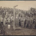 1915.V.22 Akasztott ember I. világháborús magyar katonák körében, hátoldalán datált vintage fotó, teteje vágott, apró szakadásokkal, 8,5×11 cm<a href="https://www.darabanth.com/hu/nagyaukcio/38/kategoriak~Mutargy-szobor-papirregiseg/Foto~15584/1915V
