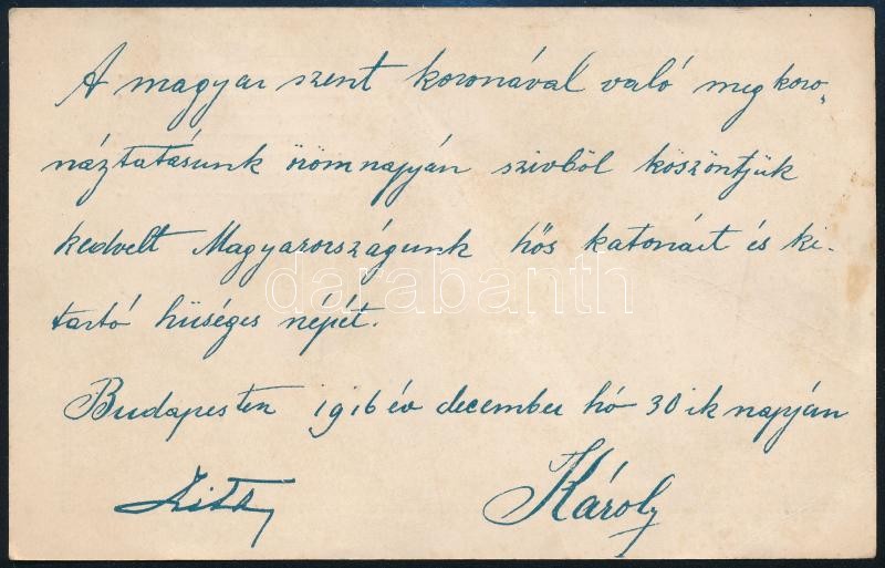 1916 Bp., IV. Károly és Zita királyné által írt nyomtatott képeslap hős katonáknak<a href="https://www.darabanth.com/hu/gyorsarveres/421/kategoriak~Mutargy-papirregiseg-egyeb/Militaria~500028/1916-Bp-IV-Karoly-es-Zita-kiralyne-altal-irt-nyomtatott-k