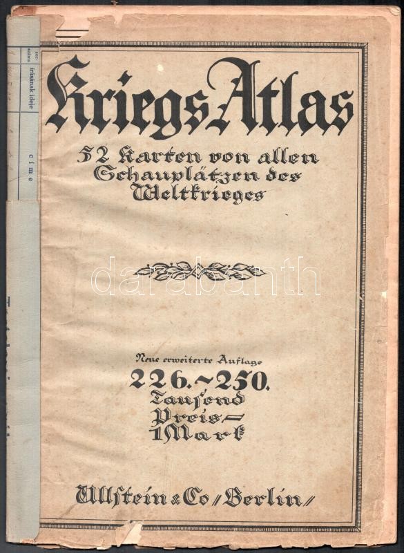 1916 Kriegs-Atlas, 52 Karten von allen Schauplätzen des Weltkrieges, sérült, 48p<a href="https://www.darabanth.com/hu/gyorsarveres/415/kategoriak~Mutargy-papirregiseg-egyeb/Terkepek~500029/1916-Kriegs-Atlas-52-Karten-von-allen-Schauplatzen-des-Weltk