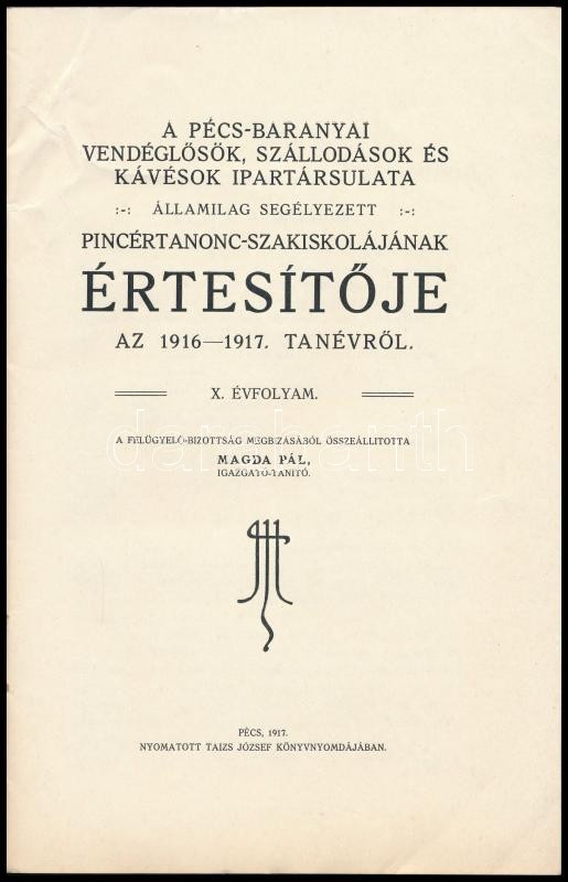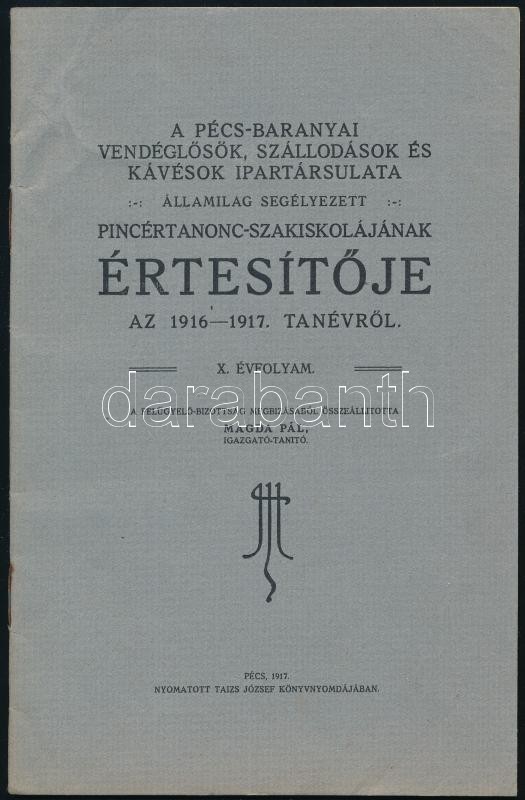 1917 A Pécs-Baranyai Vendéglősök, Szállodások és Kávésok Ipartársulata államilag segélyzetett pincértanonc-szakiskolájának értesítője az 1916-1917. tanévről. X. évf. Összeáll.: Magda Pál. Pécs, 1917, Taizs József, 27 p.