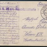 1917 KUK 46. Szegedi Gyalogezred temetője valahol a fronton, 38cm tüzér század tábori bélyegzővel.