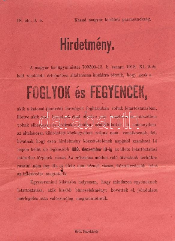 1918 Hirdetmény. A magyar hadügyminiszter hirdetménye, foglyok és fegyencek tárgyában, Kassai magyar kerületi parancsnokság, Nagykároly, Róth-ny., kis lyukkal, hajtásnyomokkal, 32×23 cm<a href="https://www.darabanth.com/hu/gyorsarveres/415/kategoria