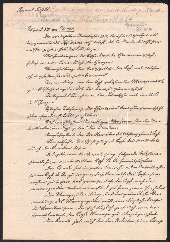 1918 Német nyelvű irat ‘Kommando der k.u.k. 2. Isonzo-Armee Inspizierender der Kriegsgefangenen’ eredeti bélyegzéssel és aláírással, 3p