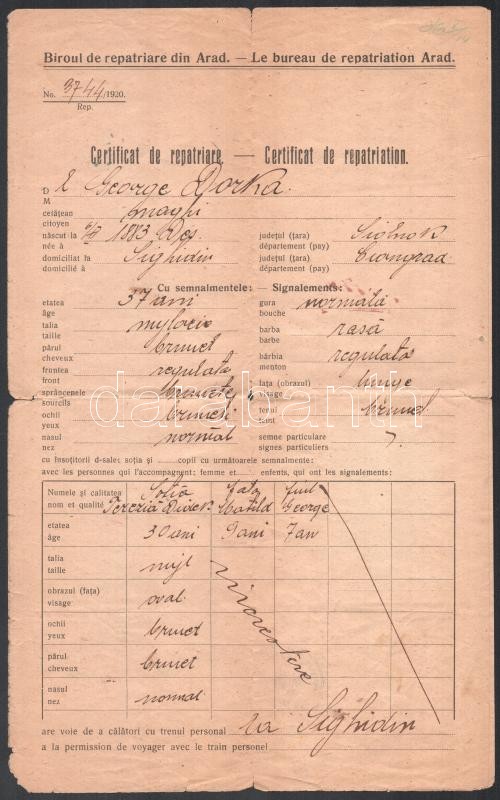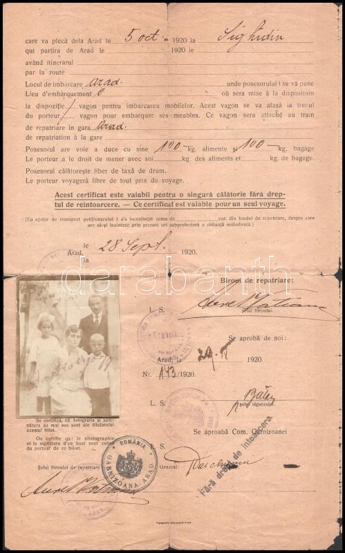 1920 Arad, négytagú magyar család repatriálási engedélye, fotókkal.<a href="https://www.darabanth.com/hu/nagyaukcio/38/kategoriak~Mutargy-szobor-papirregiseg/Okmanyok~15581/1920-Arad-negytagu-magyar-csalad-repatrialasi-engedelye-fotokkal~II2605176/?