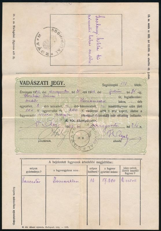 1921 Vadászati jegy vadőr számára