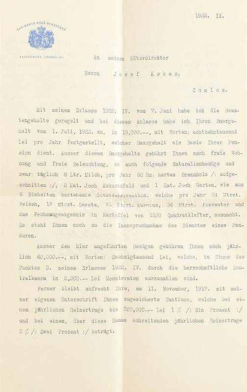 1922 Komlós, San Marco hercegné rendelkezése Kokas József juttatásaival kapcsolatban, saját kezű aláírásával