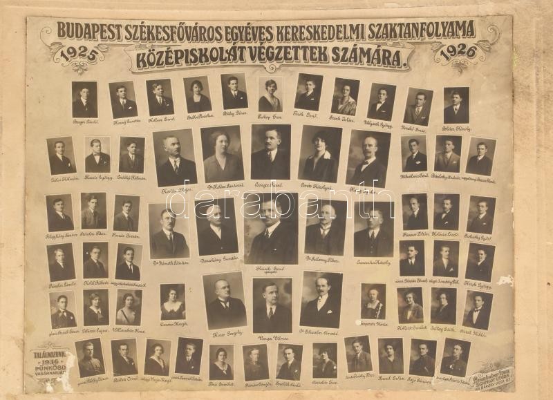 1926 ‘Budapest Székesfőváros egyéves kereskedelmi szaktanfolyama középiskolát végzettek számára 1925-1926.’ tablófotó, Bp., Brunhuber Béla műterméből, foltos kartonnal, a felületén sérülés nyomokkal, 19×24 cm<a href="https://www.darabanth.com/hu/gyo