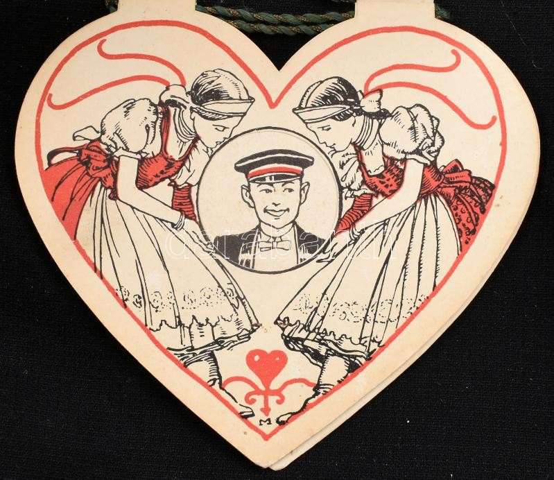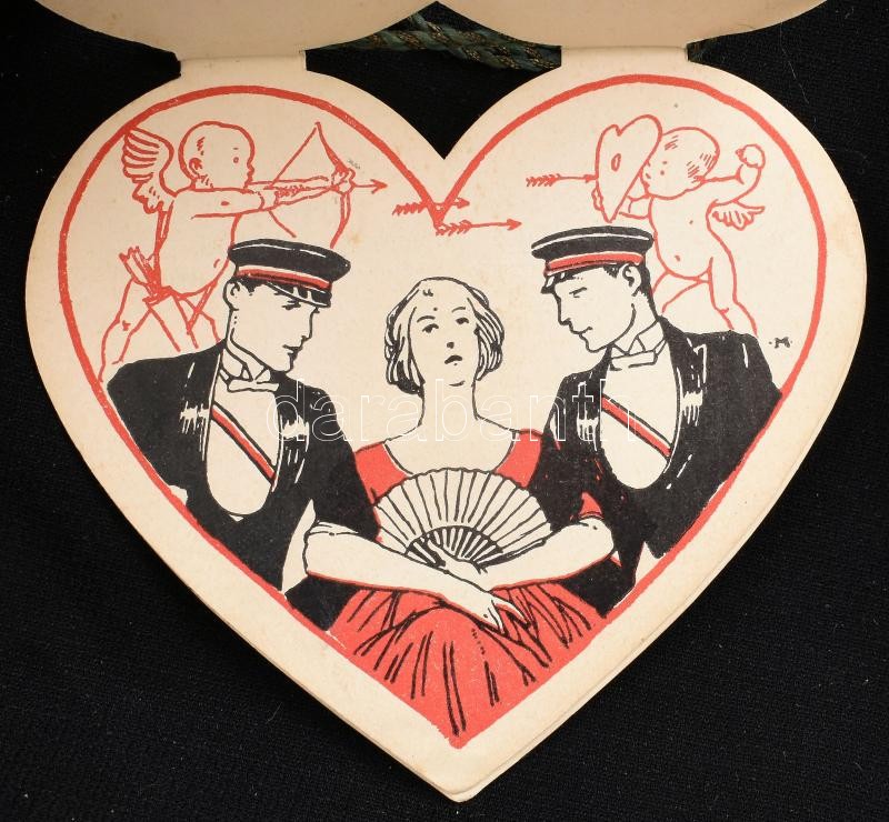 1927 Táncrend. 4 oldalas Márton Lajos tervezte grafikával, egymást átfedő képekkel, szív alakú papír borítóval + bőr borítású, domborműves puder párnával. Készítette Tull Victor udvari szállító. Minimális sérüléssel.<a href="https://www.darabanth.co