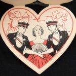 1927 Táncrend. 4 oldalas Márton Lajos tervezte grafikával, egymást átfedő képekkel, szív alakú papír borítóval + bőr borítású, domborműves puder párnával. Készítette Tull Victor udvari szállító. Minimális sérüléssel.