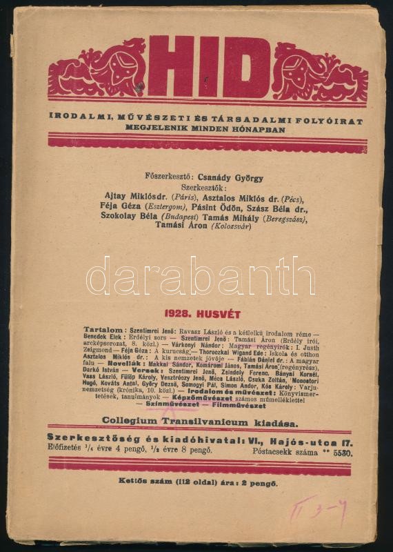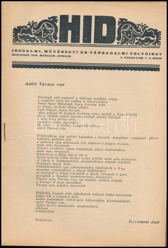 1928 Hid irodalmi, művészeti és társadalmi folyóirat, II. évf. 3-4. sz., 1928. márc.-ápr., szerk.: Csanády György. Bp., ‘Kárpát’-ny., 113-224 p. Kissé sérült papírkötésben.