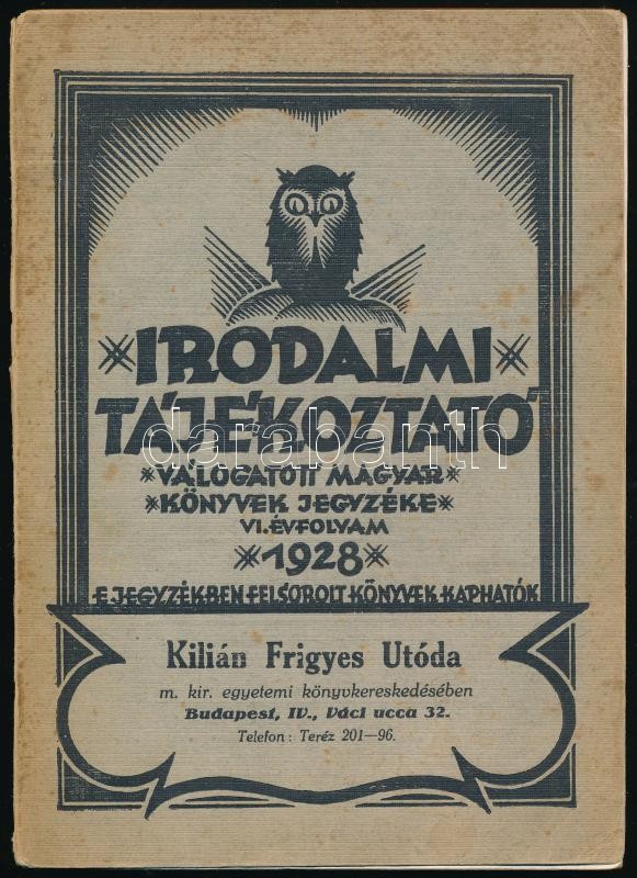 1928 Irodalmi tájékoztató. Válogatott magyar könyvek jegyzéke. VI. évf. 1928. Bp., 1928., Révai. Kiadói kissé foltos papírkötés.<a href="https://www.darabanth.com/hu/gyorsarveres/417/kategoriak~Konyvek/Konyvek-Egyeb-ritkasagok~500022/1928-Irodalmi-t